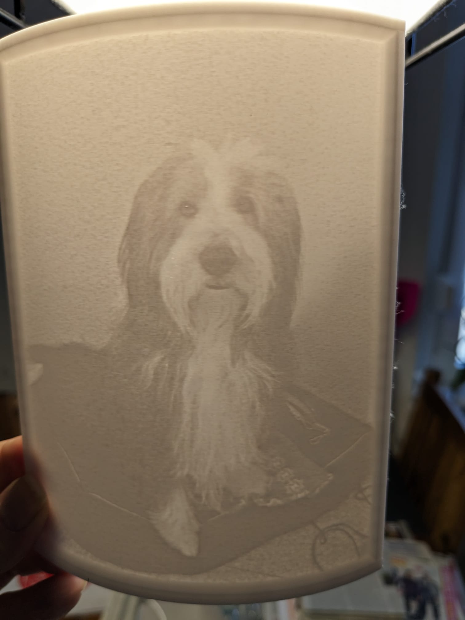In der Regel benutze ich weißes PLA, diese Bilder sollten keinen Temperaturen über 40 Grad Celsius ausgesetzt werden, da sich das Material dann verformen kann.